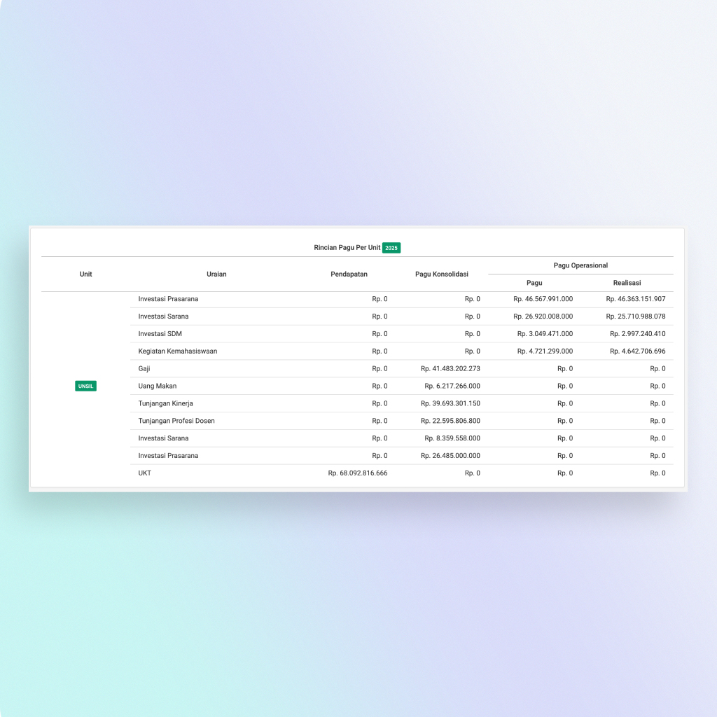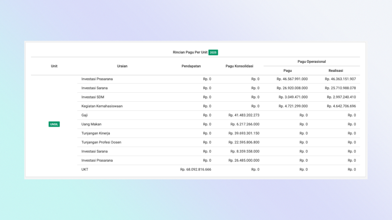 In 2020, I worked on enhancing the SIPAUS Budget Management System at Siliwangi University (an existing system at the time). I added new features for initial budget proposals and fund withdrawal planning, improving the efficiency of financial management processes.